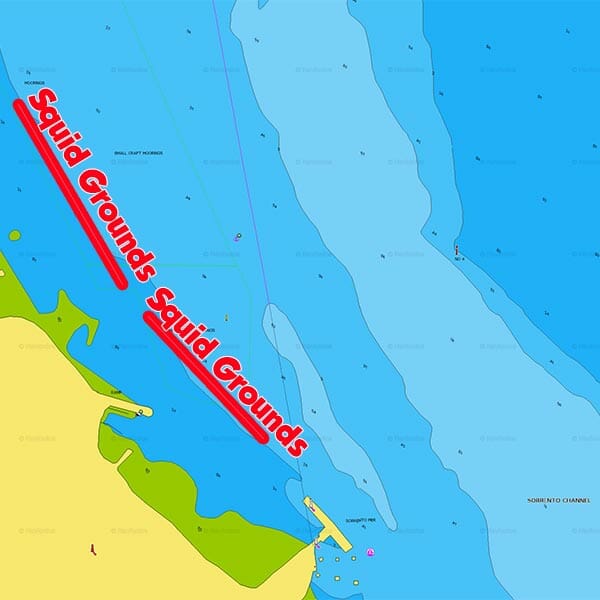 Squid Is Really easy to catch in the Southern end of Port Phillip Bay. Just look for weed banks & broken ground. in Map on the right is where we got our fresh squid, there are lots of moored Small boats around, flick your jigs around and it should not take long to get a few, there is also some good whiting ground in there too, Simply look for the sand holes.